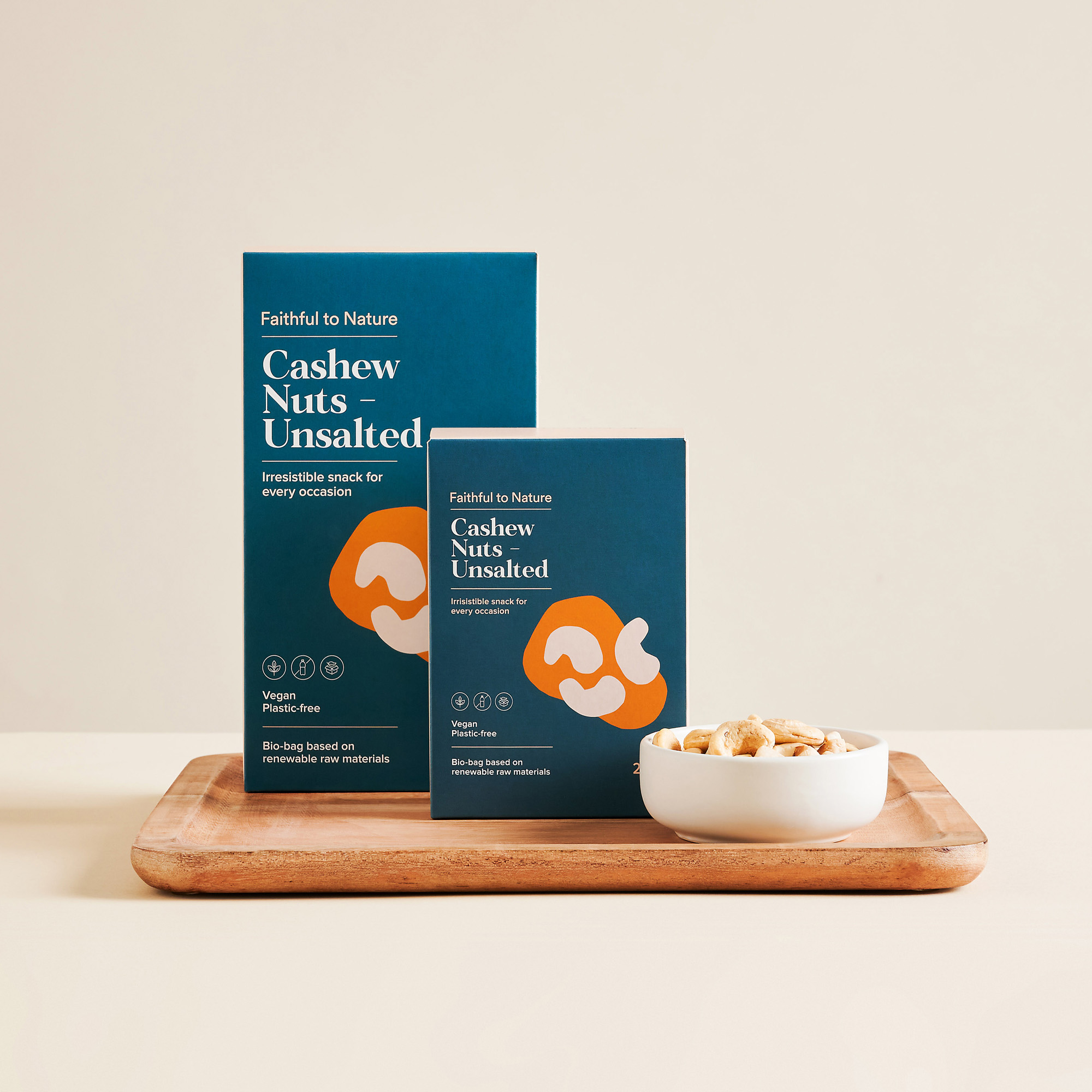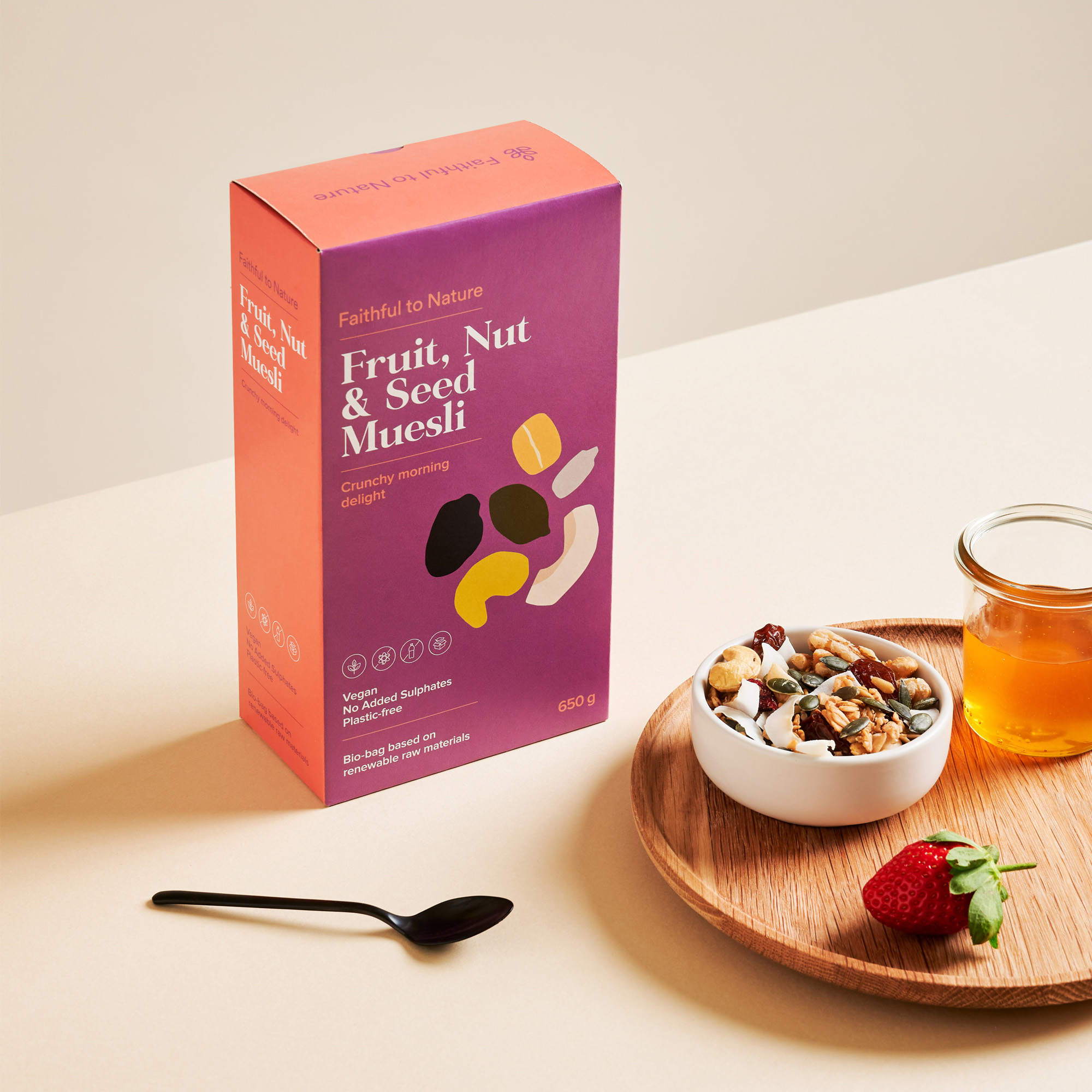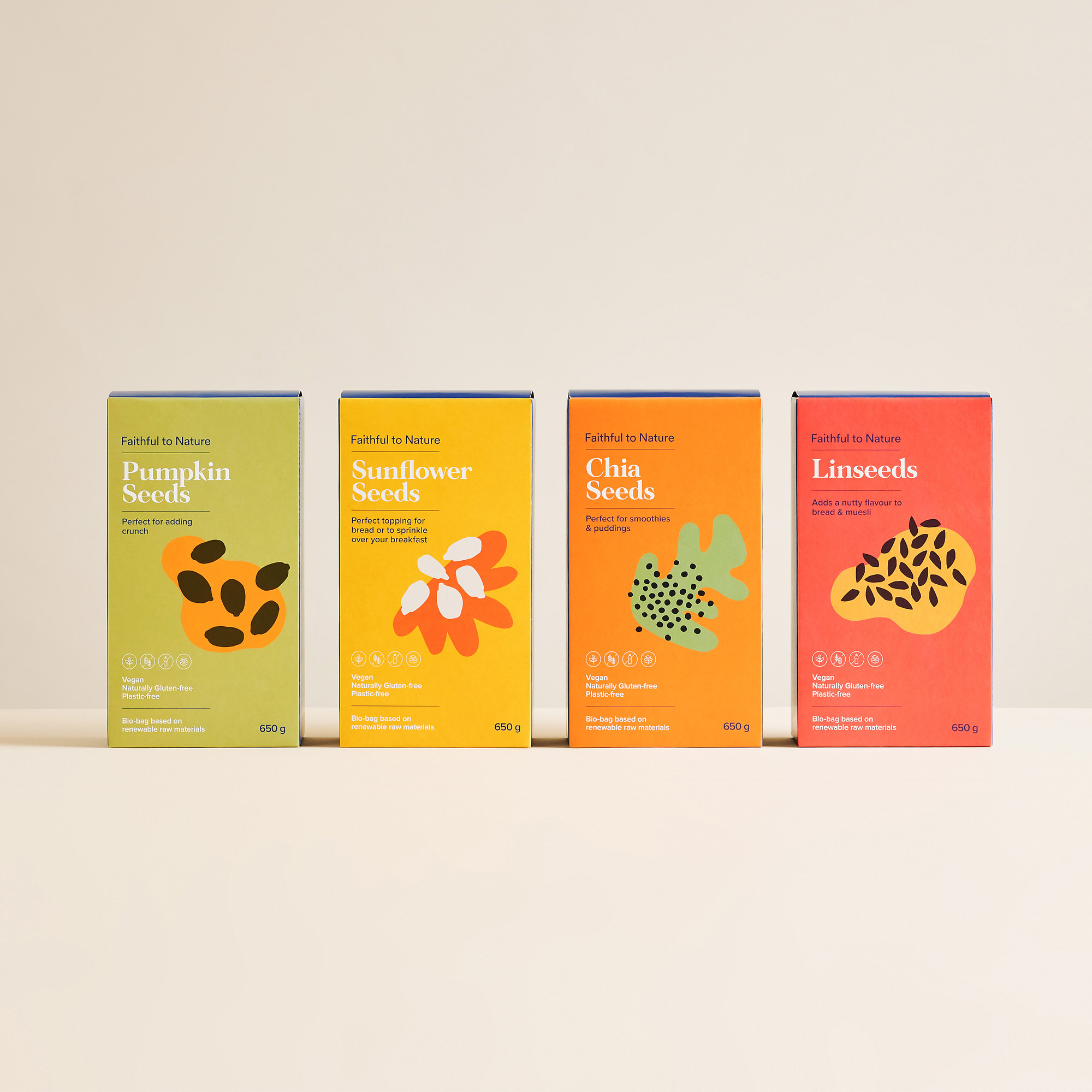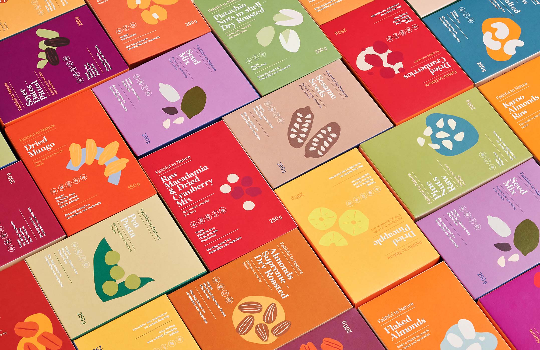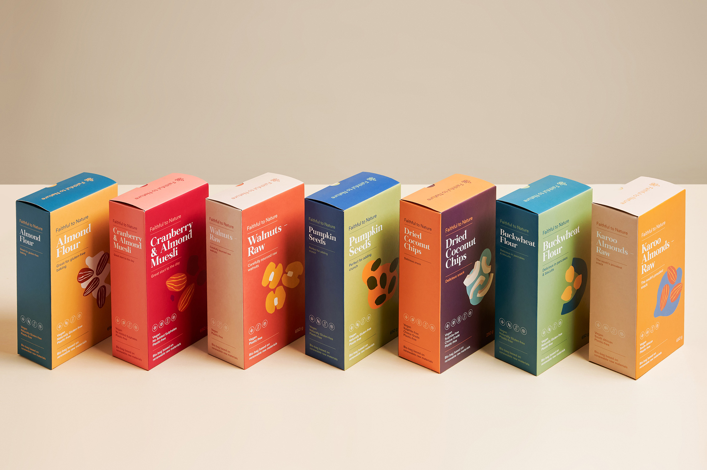 共同的元素,如標(biāo)志設(shè)計(jì)定位,字體和標(biāo)題層次仍然貫穿于所有產(chǎn)品,以創(chuàng)造一致性,跨越所有范圍,并喚起品牌認(rèn)知度。包裝設(shè)計(jì)忠實(shí)于大自然的標(biāo)志性無(wú)廢料包裝,有環(huán)境之心。儲(chǔ)藏室的貨物都是用植物纖維素制成的袋子,F(xiàn)SC認(rèn)證的盒子里印著植物用的墨水.所有忠實(shí)的自然紙箱是100%堆肥。