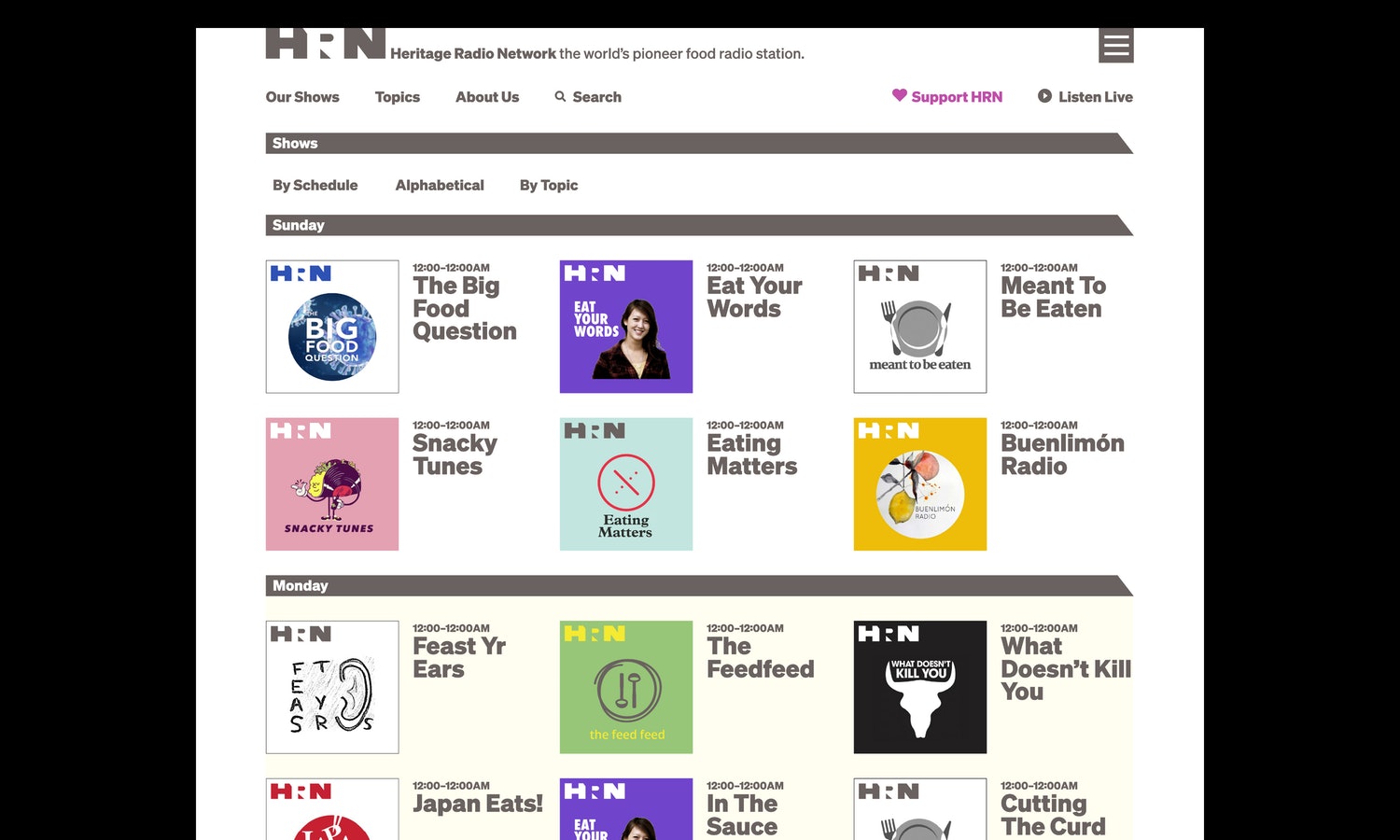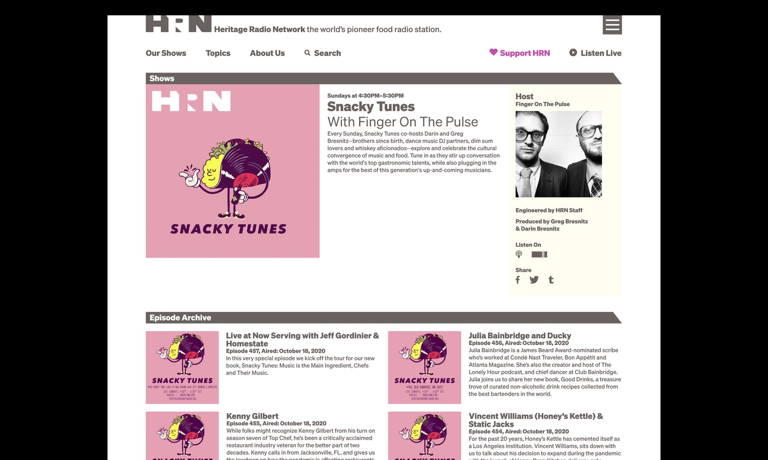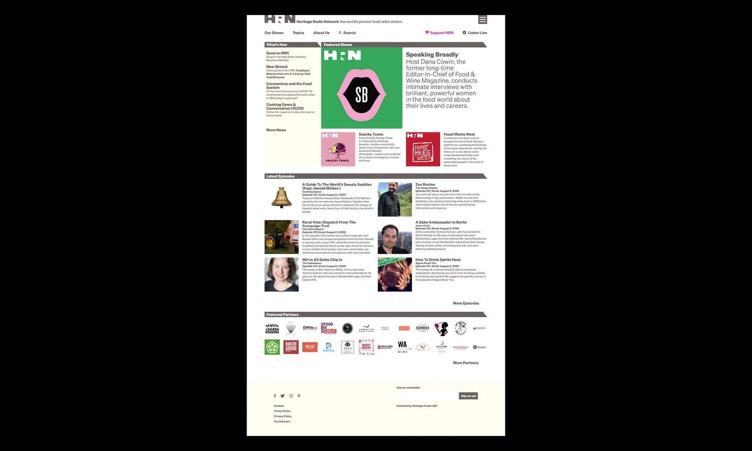 遺產(chǎn)無(wú)線電網(wǎng)絡(luò)(HRN)是世界上首屈一指的食品廣播電臺(tái)。非營(yíng)利性播客網(wǎng)絡(luò)每周播出40場(chǎng)與食品相關(guān)的節(jié)目,涵蓋從可持續(xù)農(nóng)業(yè)、食品技術(shù)和全球食品供應(yīng)到家庭烹飪、個(gè)人營(yíng)養(yǎng)和健康、以及餐館和餐飲等各個(gè)方面。HRN啟用了一個(gè)新的品牌標(biāo)志設(shè)計(jì)和網(wǎng)站,幫助提高其知名度,并為其編程提供了一個(gè)具有凝聚力的視覺形象設(shè)計(jì)。HRN成立于2009年,受慢速食品運(yùn)動(dòng)的啟發(fā),在著名餐廳后院的兩個(gè)回收集裝箱中運(yùn)作。羅伯塔比薩在布魯克林。該網(wǎng)絡(luò)的節(jié)目可以通過(guò)Sticher、Apple播客和其他平臺(tái)訪問(wèn),也可以在自己的網(wǎng)站上訪問(wèn),該網(wǎng)站擁有超過(guò)1.5萬(wàn)集的庫(kù)。HRN需要一個(gè)身份,使它能夠在品牌形象上“擁有”跨越不同平臺(tái)的播客,同時(shí)允許單個(gè)程序發(fā)光發(fā)熱。