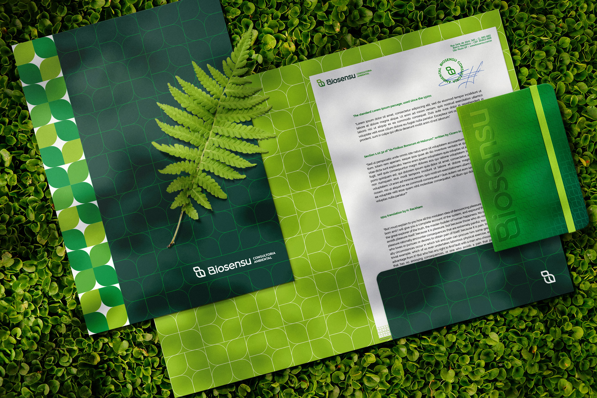 標識設(shè)計中需要呈現(xiàn)的屬性是:現(xiàn)代、系列、精致和有機,并且還要求使用綠色(最終分解為具有各種深淺綠色的彩色調(diào)色板)。品牌形象設(shè)計是設(shè)計一個具有足夠強烈個性的符號和排版,可以一起使用或單獨使用,此外,還可以從美學角度參考該公司的細分市場:環(huán)境咨詢/自然/樹葉。該標志設(shè)計源于葉子+字母B(公司的首字母)的設(shè)計,具有有機的美學和顯著的特征,即一些圓滿的結(jié)尾,而另一些則更直。這一特點激發(fā)了排版設(shè)計的靈感,這是一種專為e Biosensu設(shè)計的無襯線字體,具有足夠的個性,可以在沒有符號的情況下使用。同樣的視覺特征也存在于一些文具中,如名片、信封等。