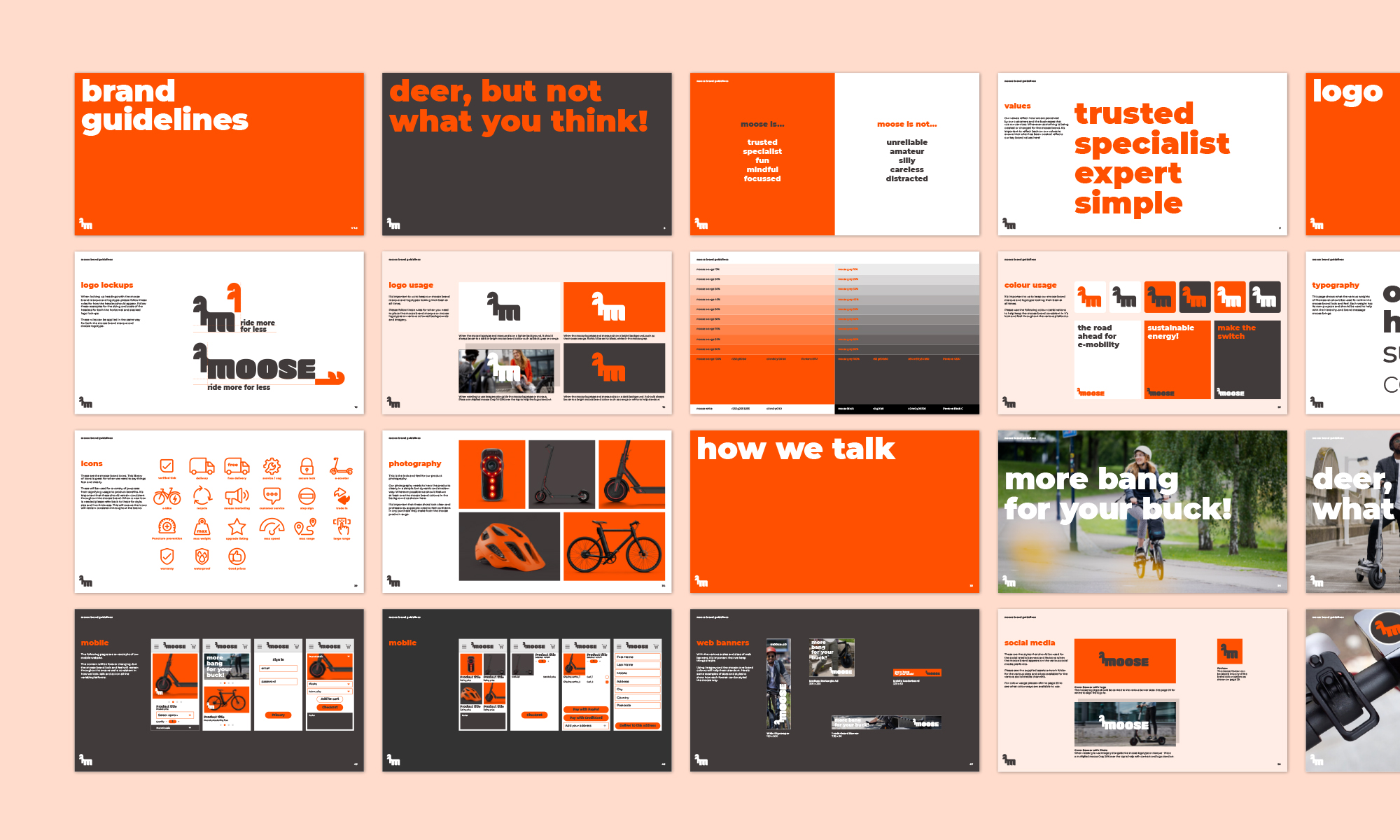 其目的是創造一個大膽、現代和獨特的身份品牌形象設計,在人群中脫穎而出,所以我們做到了!我們從這個名字開始,給他們一個不會被認為太直白的名字,一個獨特的名字,可能會帶來一種好玩的態度和語調,在他們的營銷、社交平臺和網站中使用,幫助他們在一個快速增長的行業中脫穎而出。駝鹿的標志設計需要在各種各樣的資產和材料中發揮作用,因此我們需要確保標識能夠被調整,并在其放置和定位的地方脫穎而出。無論是電動踏板車或電動自行車,還是他們的在線營銷材料和網站。