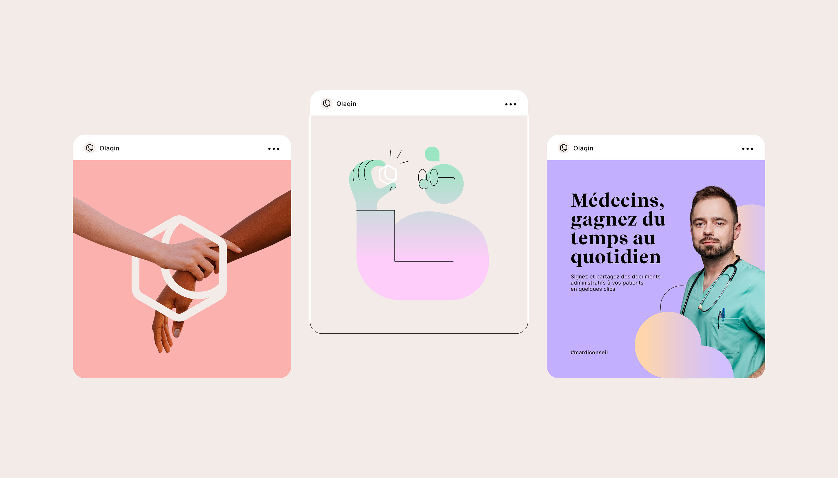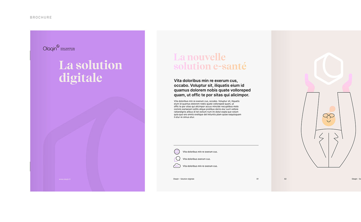 到目前為止,公司指南使用的是從圖像庫中獲取的非個人圖像。新品牌形象設(shè)計的圖像將體現(xiàn)護理和醫(yī)療護理的照片與色彩繽紛、富有詩意的插圖結(jié)合在一起。主要目標是提出一個獨特的圖像,傳達為患者和衛(wèi)生專業(yè)人員提供界面服務(wù)的理念。Recif 字體的實線和流暢線條的有機品質(zhì),結(jié)合其襯線的粗糙度,為布局提供了靈活性。這種印刷選擇與通常用于數(shù)字的“無襯線”印刷風格形成鮮明對比。這是使品牌人性化的印刷選擇。柔和的色彩環(huán)境對應著奧拉欽運作的醫(yī)療宇宙的護理功能。漸變直接喚起了品牌服務(wù)的數(shù)字背景。