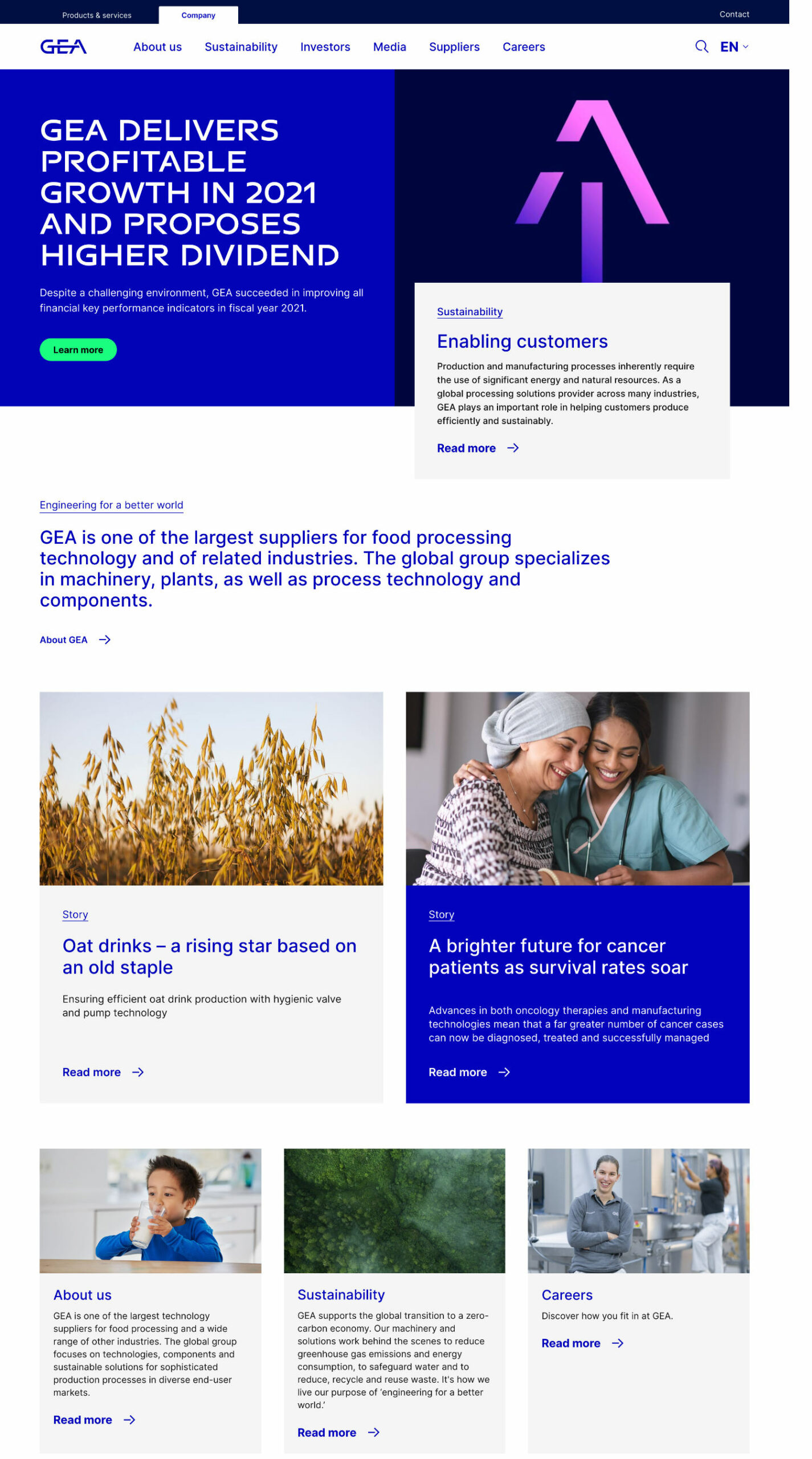 自從作為 GEA 集團出現以來,該公司首次獲得了新的集團標志設計。藍色和灰色的房屋顏色得到了進一步的發展,有利于以群青藍為主要顏色,綠色和紫色或紅色為次要顏色的色譜。新的企業設計已經在 3 月初重新啟動的網站 gea.com 上實施。