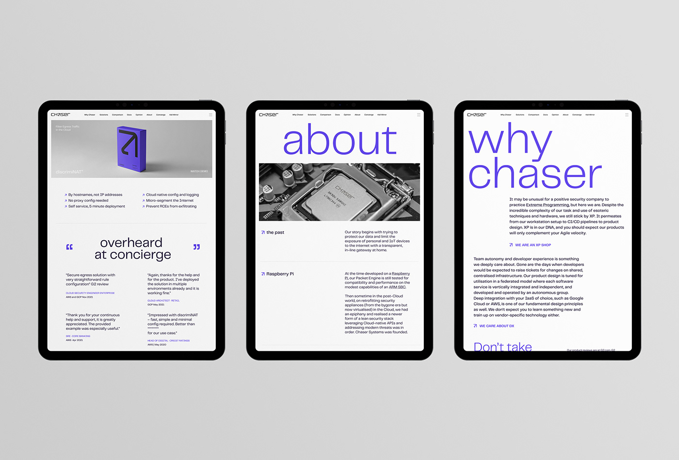 Chaser 的客戶是那些本質上需要強大而可靠的安全系統來保護他們處理的信息的公司。他們通常是銀行和金融服務、商業管理、計算機和技術咨詢、數據管理、保險等行業的公司。Chaser Systems 希望一個新的品牌形象設計,使其能夠將自己定位為歐洲領先的網絡安全公司之一,該領域主要由美國或以色列公司主導。