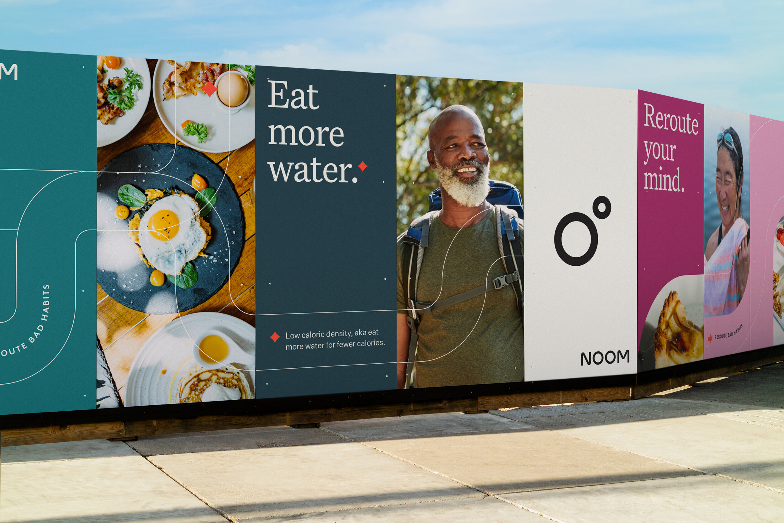 該系列調(diào)色板的靈感來自我們周圍的世界——從美味水果和蔬菜的豐富色調(diào)到郁郁蔥蔥的風景和舒緩的紋理。一系列圖形標記旨在引導觀眾的眼睛,一個強大的布局系統(tǒng)告知從攝影到信息的每個元素如何協(xié)同工作。我們設(shè)計了一種拼貼方法和建造指南,為Noom品牌設(shè)計的心理學支持的課程創(chuàng)建插圖,這在新的應(yīng)用程序和網(wǎng)站設(shè)計中得到了利用。