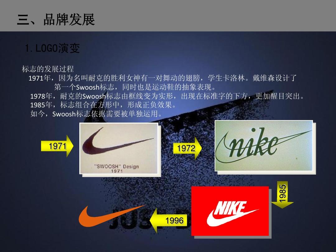 2.1978年,耐克的Swoosh標志由框線變為實形,出現在標準字的下方,更加醒目突出。