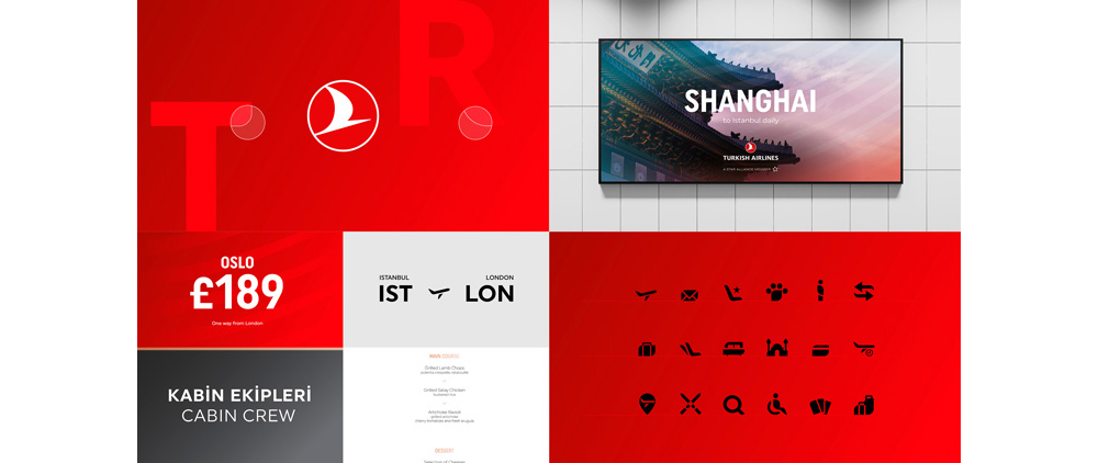 新品牌的特色是一個精細化版本的大雁標志封裝在圓形內,圓形內采用平滑的紅色。大雁被扭曲,調整了對角傾斜度,同時體型縮小,頭部與圓圈分離,制造出空間感。圓形外框設置為白色,得到一個紅白相間的核心調色板。字體方面除繼續選用無襯線字體外,部分字母上做了圓角處理。Imagination表示,與該標志相伴的是由七條水平線組成的波浪圖,旨在反映世界七大洲,更符合其國際航空公司的身份。并補充稱,該標志位于線條圖形的“匯聚點”或中心,代表著“全球旅游中心的土耳其航空公司”。