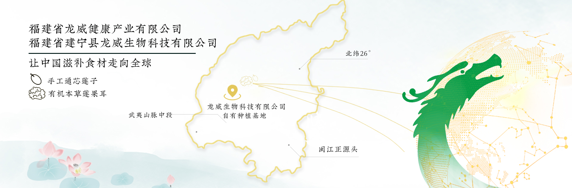 龍威貢牌是福建省建寧縣龍威生物科技有限公司的品牌。公司位于福建閩西北,具有得天獨厚優良氣候與環境.地處閩江源頭,閩江源頭的水質極佳,無污染。龍威貢牌蓮子,龍威貢牌銀耳(白木耳)就是用閩江最源頭的水灌溉著。其蓮子粒大,粉.嫩.香。銀耳口感似燕窩,富含豐富的植物膠質,享素食燕窩之美譽。公司已建成農場化蓮子基地1000多畝,銀耳(白木耳)種植基地200畝,專業計術員工廠化統一管理,種植過程中不使用化肥農藥,產品全部可經國際檢測SGS機構檢測368項農殘合格,主要出口到美國,臺灣,日本,香港.新加坡。