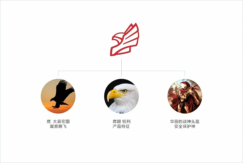 看似冰冷的工業品也應該與人類建立溫暖的情感關系。創新進取、技術高超、勇敢堅韌,掌門神是守護人類安全的可靠衛士。易品牌設計小組以守護神作為原型,提取最能表達守護神形象的“戰神頭盔”作為品牌LOGO主體元素,融入具有宏大、騰飛寓意,且象征掌門神產品非常敏銳的“獵鷹”元素,以紅色和灰色作為品牌主色調,形象威猛、硬朗中不失親切感。以“可靠&信賴”作為超級符號的創作理念,整套視覺系統呈現高端感、品質感、國際感、可靠感
